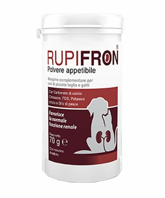 Rupifron polvere appetibile è un mangime complementare per cani di piccola taglia e gatti, formulato con Chitosano e FOS per favorire la normale funzione renale.